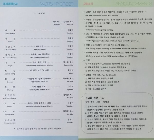 날짜: 2023.11.20 글쓴이 : 박귀성 | 특별예배 Special Service