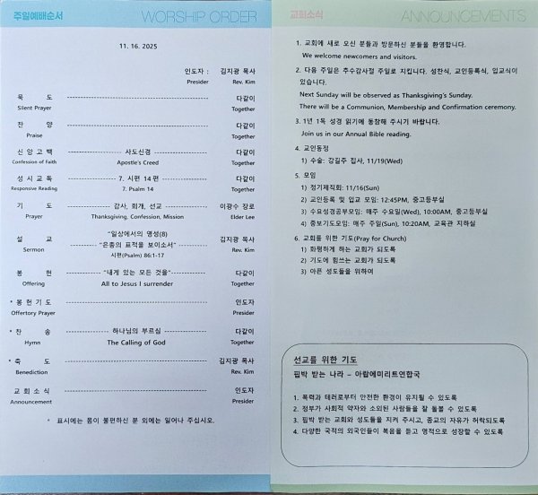 날짜: 2025.11.10 글쓴이 : 박귀성 | 특별예배 Special Service
